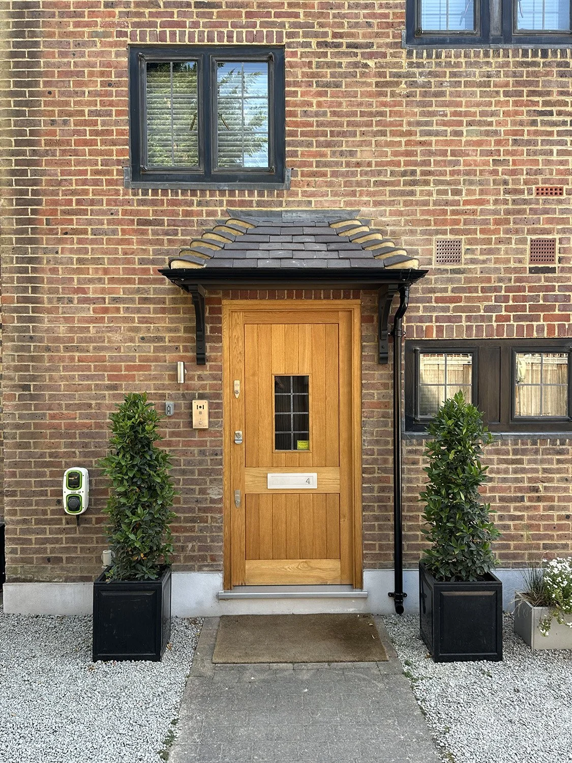 We recently completed a small yet highly interesting project within the Hamstead Garden Suburb. Aside from being designated as a Conservation Area, this part of London was originally developed in the 19th century as a pioneering model community and is characterized by beautiful houses set within a stunning landscape. The masterplan for the area was crafted by the prominent architect Raymond Unwin, with specific parts designed by Edwin Lutyens. Our client owns a maisonette located in a 1905 building constructed in the Arts and Crafts style, which was converted to residential use approximately 15 years ago. While the property itself is not Listed, it remains part of a conservation area and falls under the jurisdiction of the Hampstead Garden Trust. The entrance door of the property had been installed flush with the external wall and suffered from ongoing maintenance issues due to persistent water damage. In response, we assisted the client by designing a new canopy intended to shelter the door and prevent further deterioration. It was essential that all proposed alterations received the necessary approvals from both the local council and the Hampstead Garden Trust. The design of the canopy emerged from extensive dialogue with the Trust, and the final outcome harmoniously aligns with the aesthetics and character of the original building.